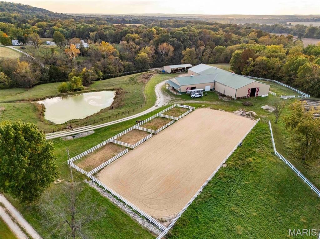 Welcome to your dream equestrian property in Pike County, Missouri! This meticulously planned equestrian property encompasses 45 acres of mixed-use land, featuring woods, fenced pastures, and hayfields. Improvements include a custom log house, detached garage (with additional living quarters), horse barn with indoor arena, outdoor arena with turnouts, and a shed. The log home is a unique gem, featuring a main-level primary suite complete with a walk-in custom closet, a soaking tub, and heated floor in the bathroom. The main level boasts a gas fireplace, a half bath, a mud room with heated floor, and a tongue-and-groove ceiling. The kitchen is equipped with an island, propane range, dishwasher, and a walk-in pantry. All appliances will convey with the sale. Adjacent to the main level, is a large deck with a spectacular view, fireplace and a bar, perfect for entertaining! The walk-out basement offers a cozy retreat with a laundry room and two bedrooms, one of which is a non-conforming space that can serve a variety of purposes. Additionally, it boasts a man cave, complete with a wood stove. The upper-level open loft overlooks the main living area. It includes a closet and a bathroom with a shower, making it suitable for a guest room or an office. The detached two-car garage, conveniently situated beside the home, has three-quarter bathroom on the main level for added convenience. The upper level has tongue-and-groove paneling that creates a warm and inviting atmosphere. This space also includes a closet, making it an ideal retreat for visitors. The property features a beautifully landscaped yard, with vibrant plants and greenery. It boasts an array of mature fruit trees, providing a delightful harvest of fruits throughout the seasons as well as a newly constructed pond and an existing pond. This property boasts a prime location, situated a mere 35 minutes from the renowned Bridlespur Hunt Club, and, is only 1 hour away from the acclaimed National Equestrian Center. This strategic positioning allows for easy access to premier equestrian facilities while still providing the tranquility and charm of rural living.