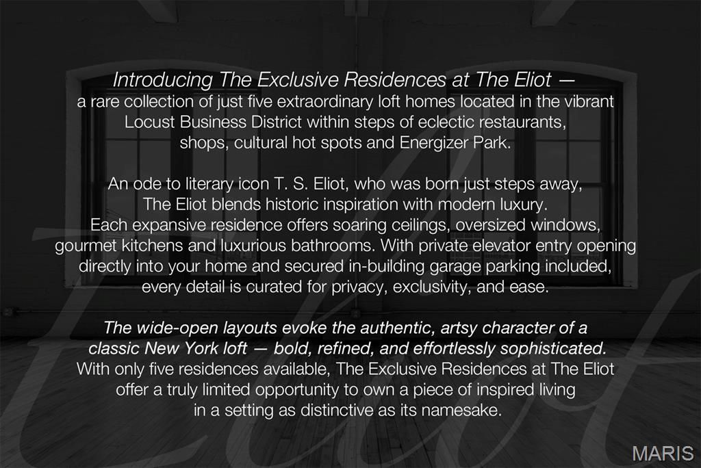 Introducing The Exclusive Residences at The Eliot - a rare collection of just four extraordinary loft homes located in the vibrant Locust Business District within steps of eclectic restaurants, boutique shopping, cultural hot spots, and Energizer Park.An ode to literary icon T. S. Eliot, who was born just steps away, The Eliot blends historic inspiration with modern luxury in a way that feels both timeless and boldly contemporary. Each expansive residence offers soaring ceilings, oversized windows that flood the interiors with natural light, chef-caliber gourmet kitchens, and spa-inspired bathrooms designed with refined finishes and exceptional attention to detail.With private elevator entry opening directly into your home and secured in-building garage parking included, every detail is curated for privacy, exclusivity, and ease. The wide-open layouts evoke the authentic, artsy character of a classic New York loft - bold, refined, and effortlessly sophisticated - while delivering a level of space and comfort that far exceeds expectations.What truly sets The Eliot apart is scale. Every loft spans over 2,000 square feet - a magnitude of living space virtually unheard of in downtown St. Louis' luxury rental market. The grand proportions create humongous living and dining areas ideal for entertaining, alongside generously sized bedrooms that feel more like private retreats than typical downtown accommodations. This is a product simply not found anywhere else in the city - an offering that redefines what luxury loft living can be.The location is as exceptional as the residences themselves. With acclaimed restaurants like Scout's, Kain Tayo, The Biscuit Joint, Blue Jay Brewing Company, Omen Coffee and The Fountain on Locust (some right across the street) and a neighborhood designed for walkability, you can leave the car behind and enjoy the best of the city on foot - from Energizer Park to Union Station and countless downtown destinations in between. It's urban living at its most effortless and connected.With only four residences available, The Exclusive Residences at The Eliot present a truly limited opportunity to secure a one-of-a-kind luxury lease in downtown St. Louis - a statement property designed for those who refuse to compromise on space, style, or distinction.