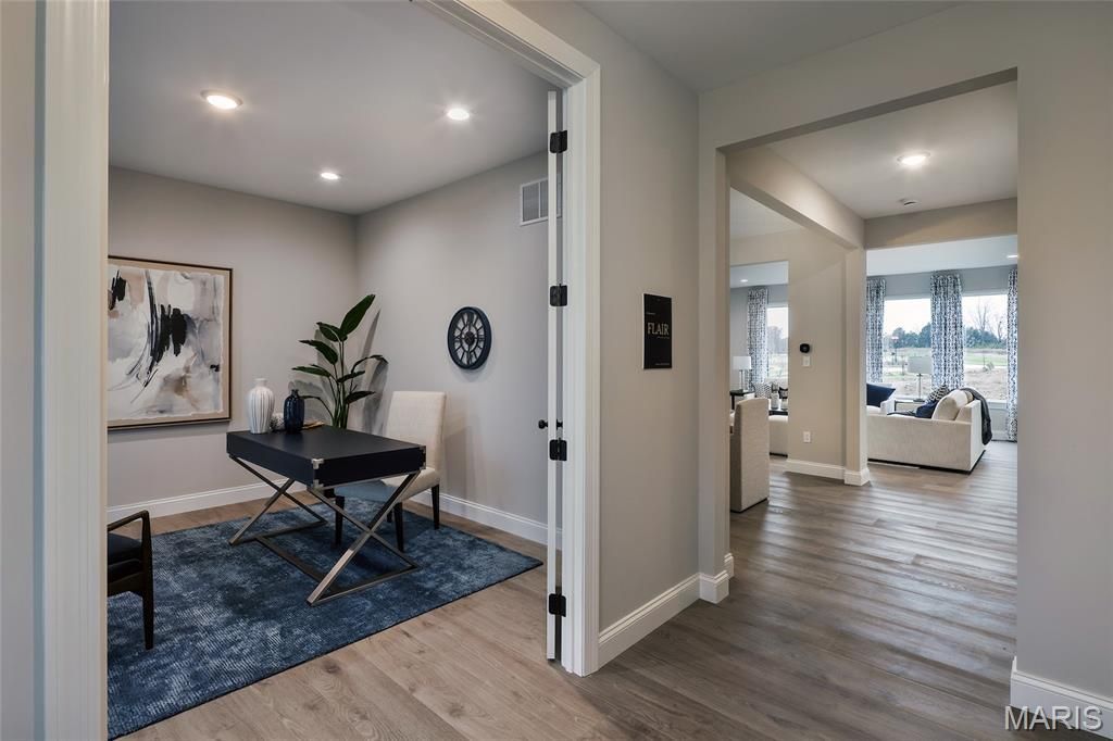 New construction by Consort Homes in the desirable Harvest community of O'Fallon. This 2-story home offers 3,215 sq ft of thoughtfully designed living space with 4 bedrooms, 3.5 baths, and a 3-car attached garage. The main level features an open floor plan with luxury vinyl plank flooring, a family room with window wall and electric fireplace, formal dining room, private study, and convenient main-floor laundry. The gourmet kitchen includes an expanded island, quartz countertops, 42 custom cabinetry with crown molding, walk-in pantry, stainless steel gas appliances, pendant lighting, and breakfast room. Upstairs, the spacious primary suite features a ceiling fan and luxury bath with soaking tub, separate shower, and double vanity. Three additional bedrooms, a bonus room, and two full baths complete the upper level. Unfinished basement with 8' pour, egress window, rough-in bath, and sump pump provides future expansion potential. Zoned HVAC, smart thermostat and landscaped lot.