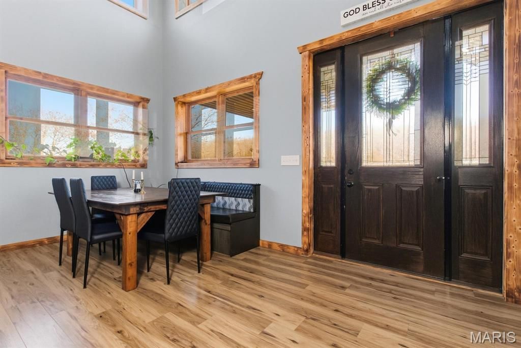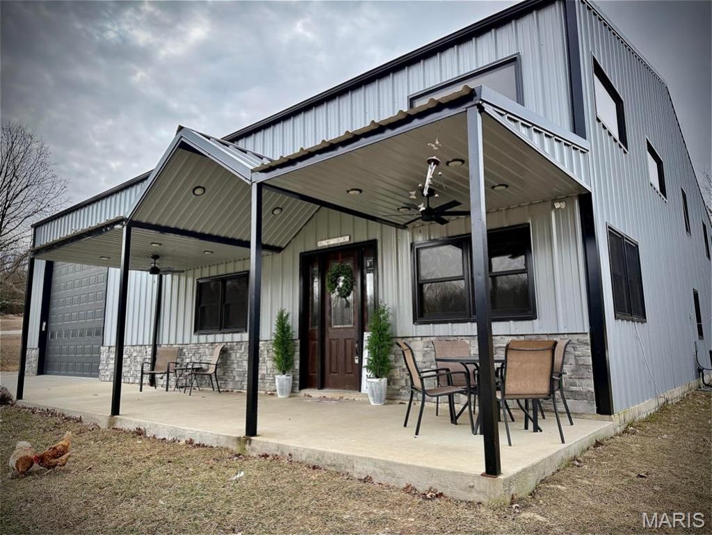 Discover the peace and privacy of country living in Bucyrus, Missouri, just a short 10 minute drive to town. Down a pretty, wooded private drive, the property is 38 acres +/- of gorgeous park-like setting, fresh air and the freedom of rural life. The extremely well-built barndominium style home features 5 bedrooms, 3 1/2 baths and nearly 2600 sq ft of living space on 2 levels. Constructed of steel beams, metal exterior frame and wood interior frame with 8' spray foam insulation, this home was built to stand the test of time. From the covered front porch you step into a great room with soaring ceilings and lots of natural light. Large kitchen with custom cabinets, an abundance of counter space and a walk-in pantry to please any cooks heart. The main level offers a master suite with a walk-in tile shower and very generous walk-in closet, additional bedroom, half bath for guests and large utility room with built in wooden lockers for convenience. Upstairs you will find a 2nd living room, master bedroom with en-suite bath, 2 additional bedrooms and full bath. Fully floored attic space for additional storage, too. From the main level utility room you can access the attached 32 x 54 heated shop with overhead door and pit drain for added convenience. An attached 22 x 64 lean-to off the rear provides plenty of parking or customizable to your needs. A year round spring fed creek, freshly cleaned out and enlarged pond just waiting on spring rains to finish filling up, and perimeter fencing makes this the ideal Ozarks full-time residence or a peaceful retreat. Perfect for multi-generational housing, homesteading, or home-based business. Located 10 minutes to the conveniences of town, near local rivers, and 1000's of acres of National Forest Land for outdoor enjoyment.