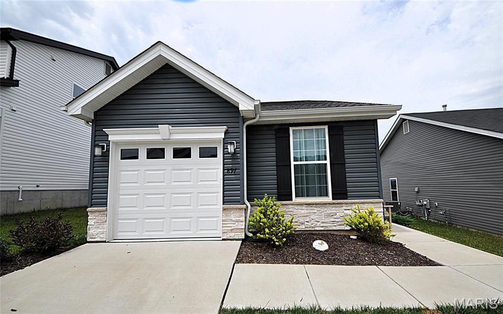BETTER THAN NEW 1.5 YRS young custom ranch home with 3 bdrms, 2.5 bths & 1900+ sq ft of living space in new Bear Ridge community of House Springs. UPGRADES GALORE! Exterior boasts modern vinyl & stone front w/oversized covered front porch & oversized one car garage. Architectural shingle 30 yr roof. Make your way inside to the entry foyer to be AWED by the open floor plan showcasing vaulted ceilings, divided bedrooms, luxury vinyl plank flooring, custom panel doors & tons of natural light throughout! Main floor living area features great rm w/gas marble fireplace flanked by white mantle. Atrium door to backyard. Kitchen/dining rm combo boasts breakfast bar, quartz counters, custom 42 modern gray cabinets, tile backsplash, oversized single bowl sink & slate stainless steel appliances. Main floor primary bedroom suite w/dbl closets & jack n jill full bath. Second spacious bedroom & 1/2 bth on main. Open staircase down to finished lower level includes sprawling family rm area, full bath with walk in shower & third bedroom w/closet & egress window bringing in TONS of light! RARE OPPORTUNITY to move in to a NEW, CUSTOM built home NOW! MUST SEE!